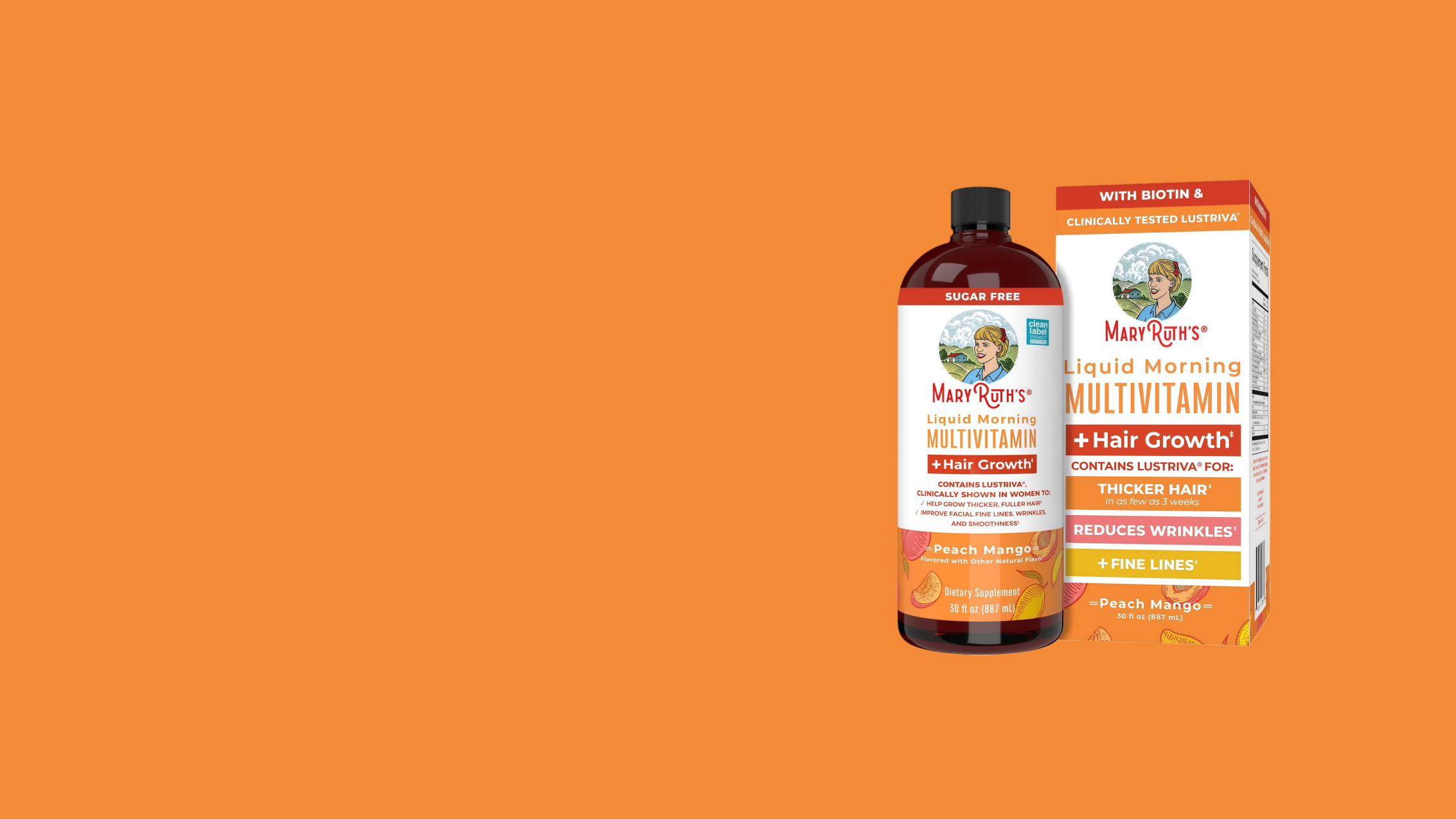 Boost your hair, skin, and nails with MaryRuth’s liquid multivitamin enriched with Lustriva®. Clinically shown to help women grow thicker, fuller hair and smooth fine lines in just weeks, this formula also nourishes your skin and supports overall wellness.*